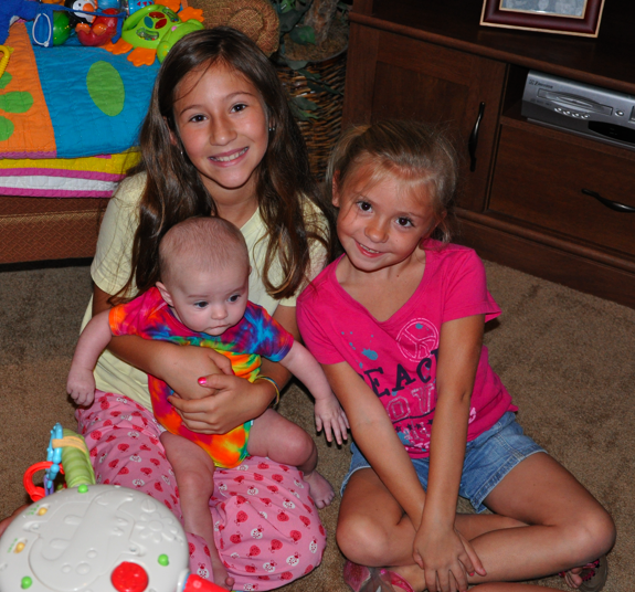 The three girls! The kids made up nicknames for the babies. They called Brooks Laughy Taffy because he laughs all of the time, Knox, Cutie Pie because he is so cute, and Ava, Miss Stinker because she poots a lot! They are pretty silly! I'm not sure if Ava will want that name to stick!